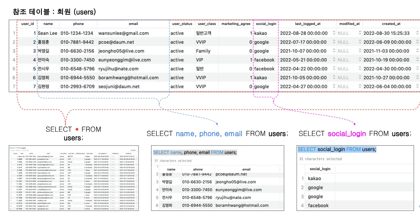 예시2 users 테이블에서 유저의 이름과 폰번호, 이메일 정보를 추출하고자 할 때