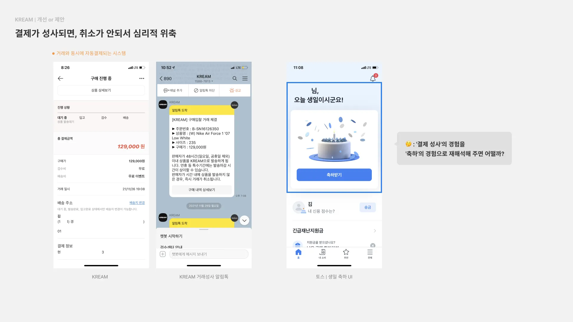 2) 결제성사 후 취소가 불가피한 상황이라면, 토스트팝업 또는 메시지로라도 '결제 성사'의 경험을 '축하'의 경험으로 재해석해 주면 어떨까?