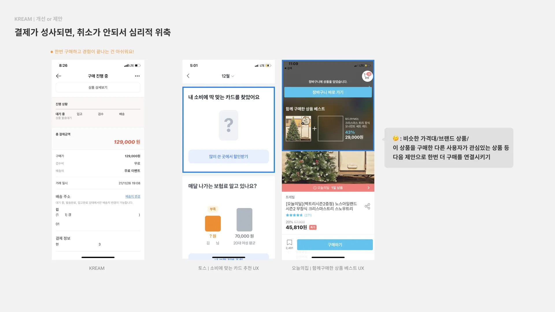 비슷한 가격대/브랜드 상품/이 상품을 구매한 다른 사용자가 관심있는 상품 등 다음 제안으로 한번 더 구매를 연결시키기 (→ 토스 소비에 맞는 카드 추천 UX/오늘의집 함께구매한 상품 베스트UX)