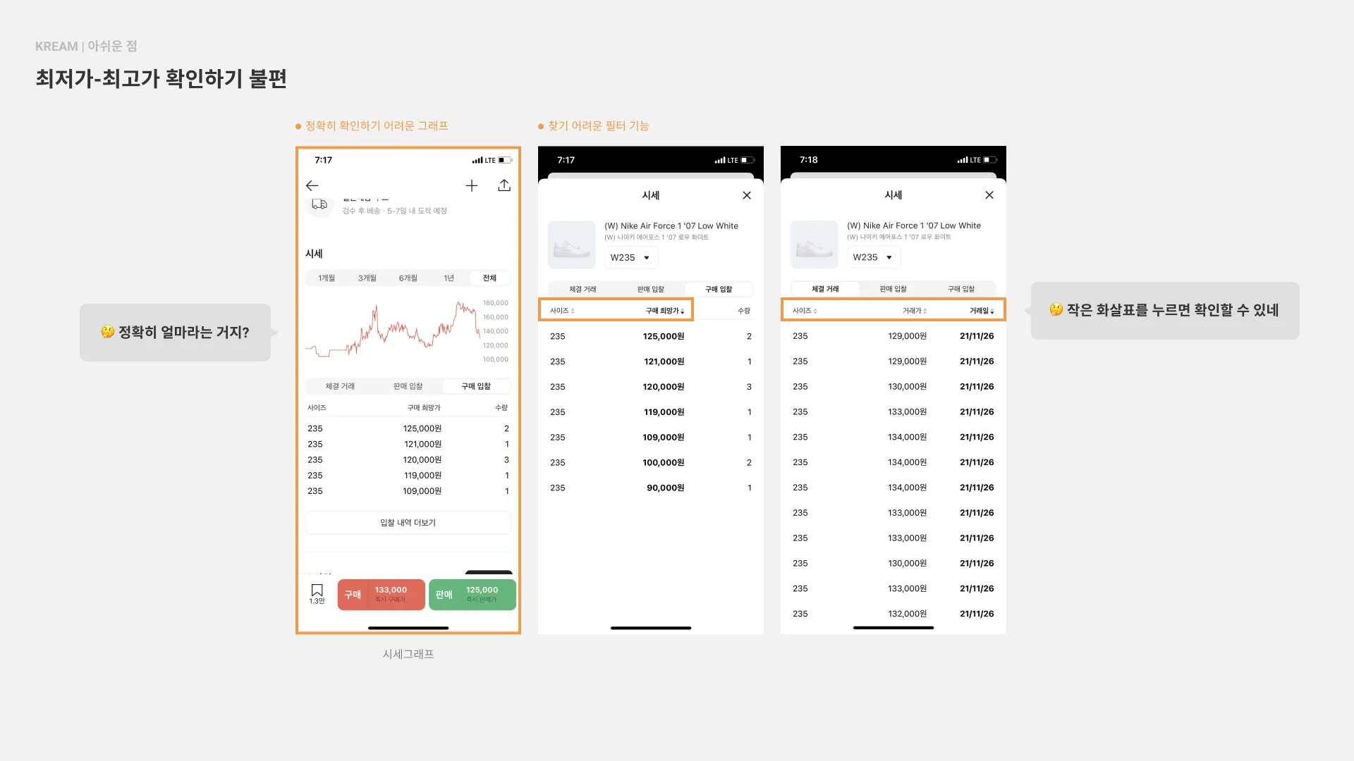 1) 최저가-최고가 보는 게 불편하다. 더 쉽게 볼 수 있는 기능이 현재 없음! 최근 거래가만 보임!
