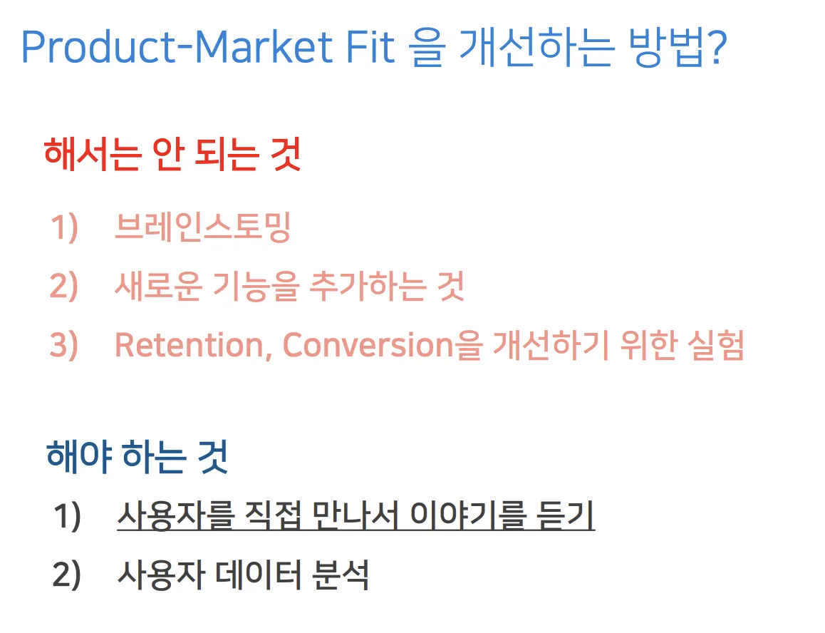 : 제품 개발 → 지표 측정 → 학습 및 개선 → 비용 최소화 / 작은 성공 경험 꾸준히 쌓기