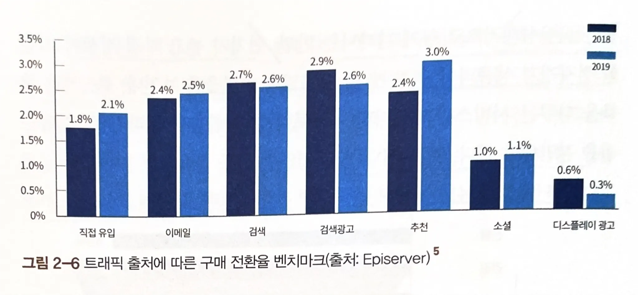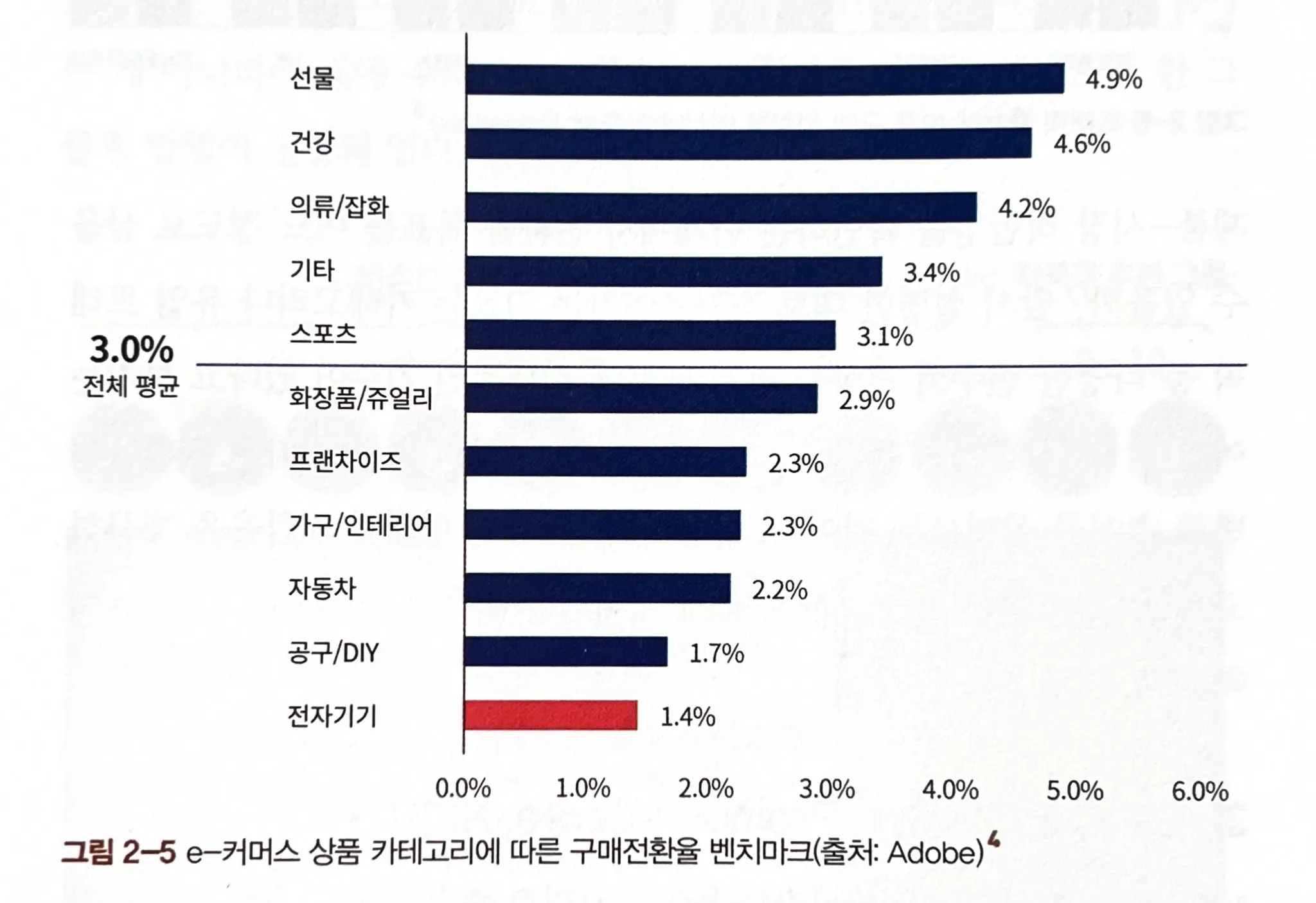 → e.g) 이커머스 : 평균 구매 전환율 3% → 선물/건강 : 2~3배 차이 → 전자기기 : 1.4%