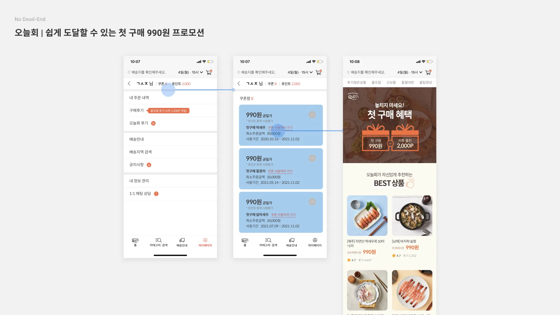 오늘회 | 오늘회도 990원 프로모션 쿠폰을 제품 각각 보여주면서 사용자에게 많은 혜택을 받는 느낌을 전달했고, 쿠폰에서 첫 구매 990원 프로모션 페이지로 도달도 매끄럽게 연결했다.