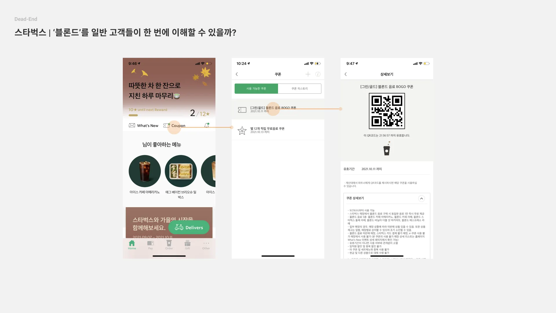 스타벅스 | 스타벅스 쿠폰은 유독 사용성이 불편하다고 느꼈는데, Dead End 때문에 그랬던 것 같다. 스타벅스의 특장점은 사이렌오더이다. 제품 탐색 → 사이렌 오더 → 쿠폰의 UX Flow는 현재 가능하지만, / 아직 쿠폰 → 제품 탐색 → 사이렌 오더 주문으로의 진입은 안되고 있다. 쿠폰코드노출에서 경험이 끝나는데 해당 과정이 개선된다면? 더 편리한 경험을 줄 수 있을 것 같다 + 추가로 스타벅스의 BOGO쿠폰 경험이 아쉬웠다. 이번 ‘블론드 음료 쿠폰‘의 블론드 음료를 사용자가 한 번에 이해할 수 있을까? 싶었다. 그래서 꼭 쿠폰→제품탐색 과정이 필요하다고 생각했다.