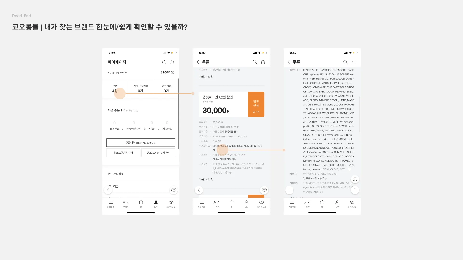 코오롱몰 | 코오롱몰 쿠폰은 적용 브랜드가 쿠폰마다 각각 다른데? 쿠폰 브랜드 네이밍을 나열하는 것에서 경험이 종료되었다. 이마저도 네이밍이 모두 영어로 나열된다는 점/작은 텍스트 크기와 많은 텍스트를 과연 사용자가 한 번에 인지하고 관심 브랜드를 찾을 수 있을까? 라는 의문이 들었다.