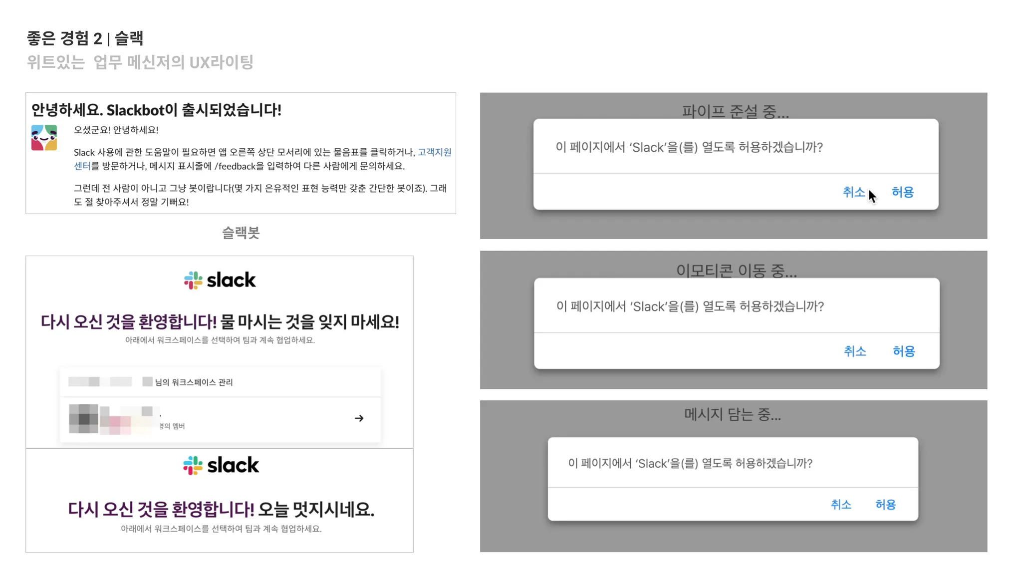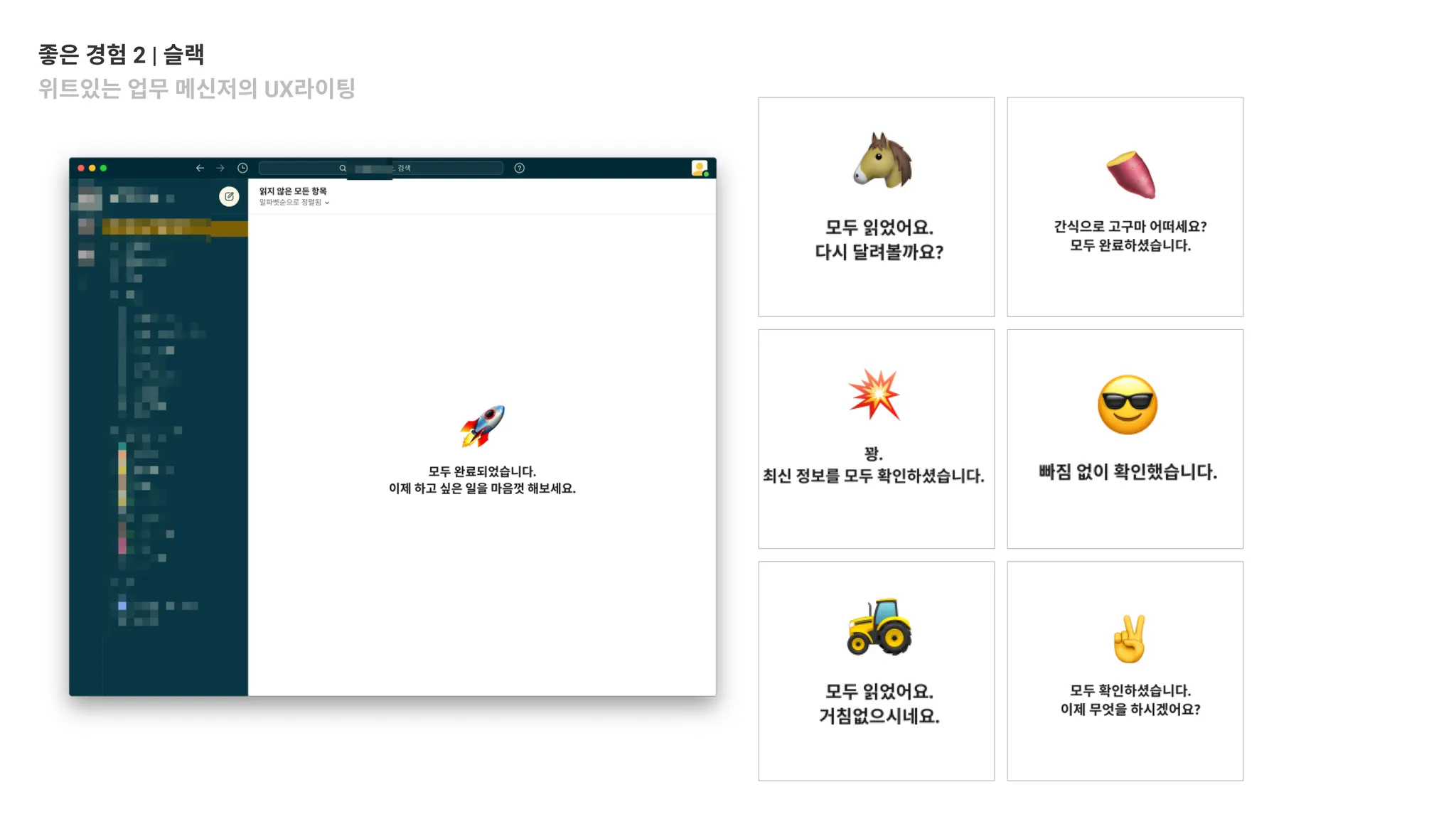 업무 협업툴이자 메신저툴인 슬랙은 업무도구로서 위트있는 메시지를 적극적으로 사용하고 있다. 흐뭇하지 않는가? 또한 슬랙봇은 쉬운 사용성 뿐만아니라, 해당 서비스와 가까운 유대감도 형성하는 장치로서 좋은 경험을 전달한다.