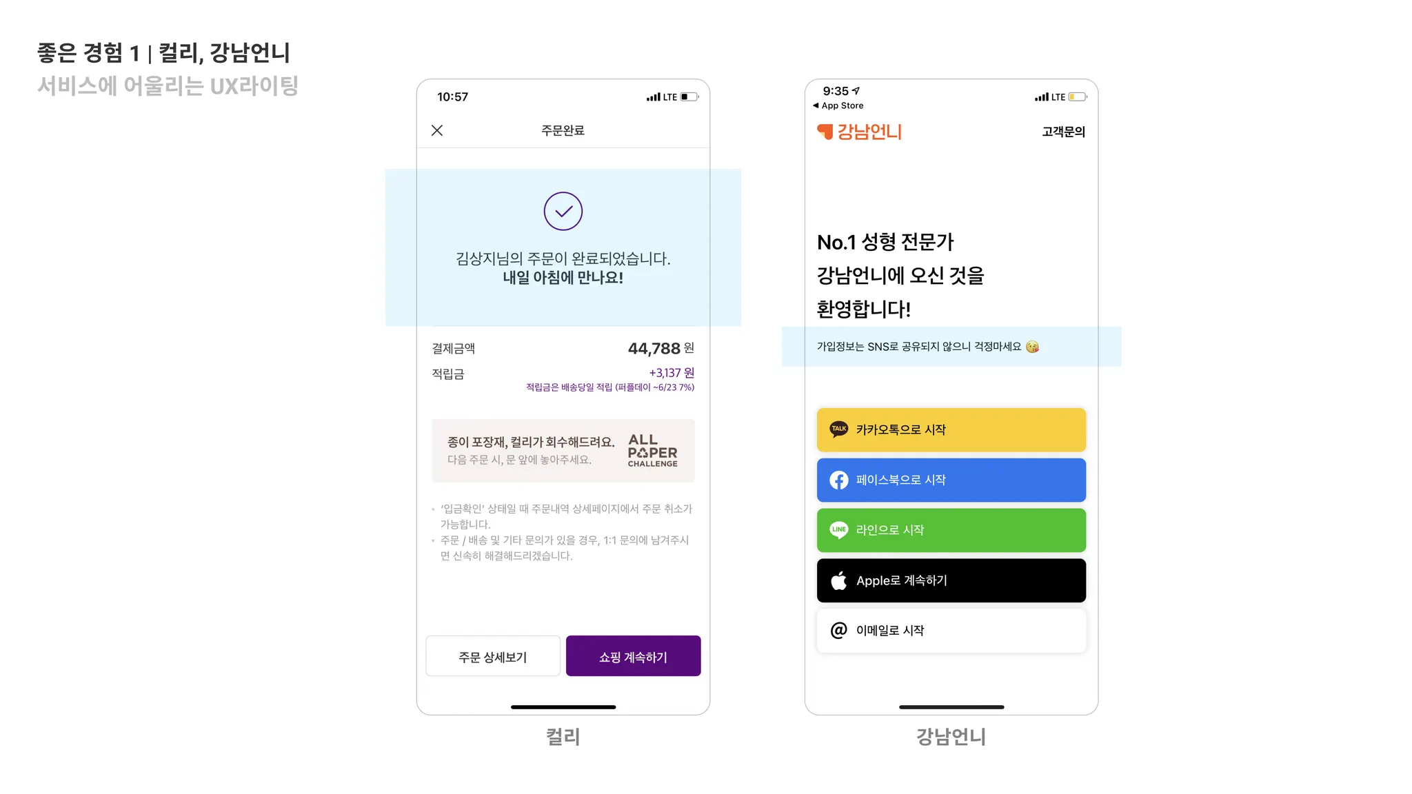 강남언니의 가입 전 안내 메세지는 "가입정보는 SNS로 공유되지 않으니 걱정마세요" 성형이라는 특수한 서비스로서 공개하고 싶지않은 사용자의 민감한 고민을 인지하고, 안심을 주는 메세지의 좋은 경험 사례이다.