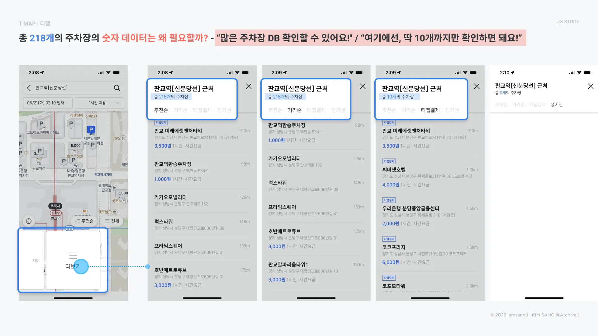 → 티맵은 점차 제공하는 정보의 양을 확장해요. 처음에는 간략하게 기본 정보로 특징을 파악하고, 최종 사용할 주차장 정보만 밀도있게 확인하도록 유도합니다.