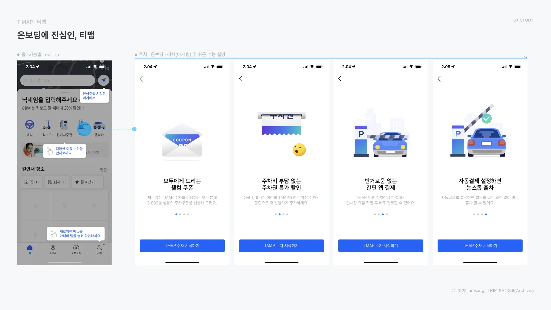: 온보딩은 보통 ‘사용법'을 알려주는 용도로 사용되는데, 티맵 추차의 온보딩 순서를 살펴보면,