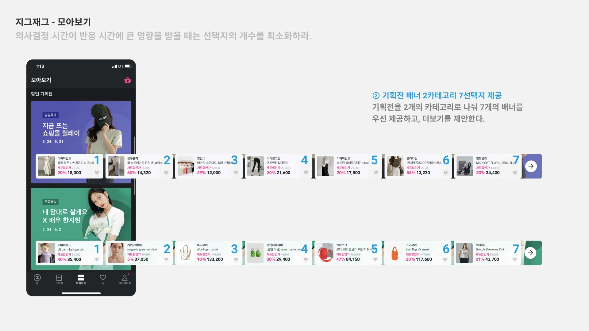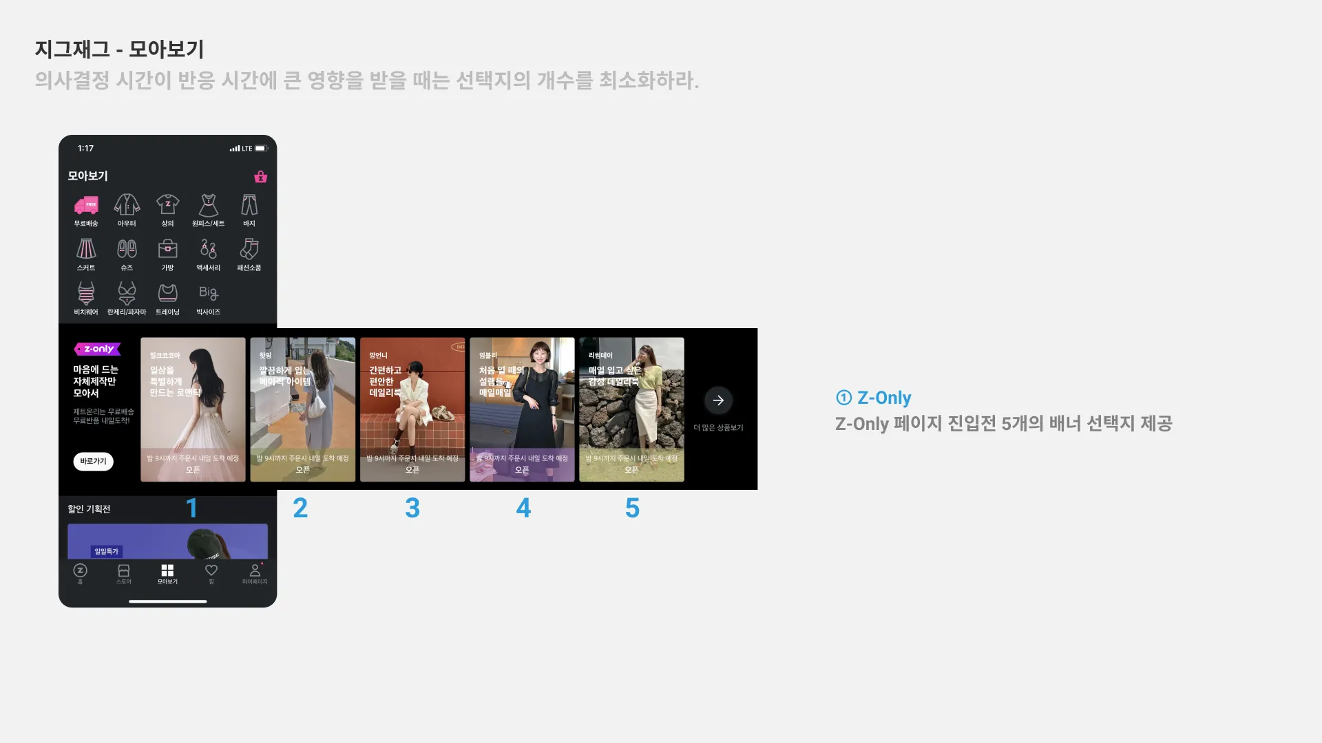 지그재그의 모아보기 탭에는 신규 서비스 Z-only(소호몰 자체 제작 상품을 밤 9시까지 주문하면 다음날 받을 수 있는 서비스), 기획전, 이벤트&트렌드 가 있다. 각 카테고리별 3-7개의 선택지를 선 제공하고 더 보기로 유입한다.