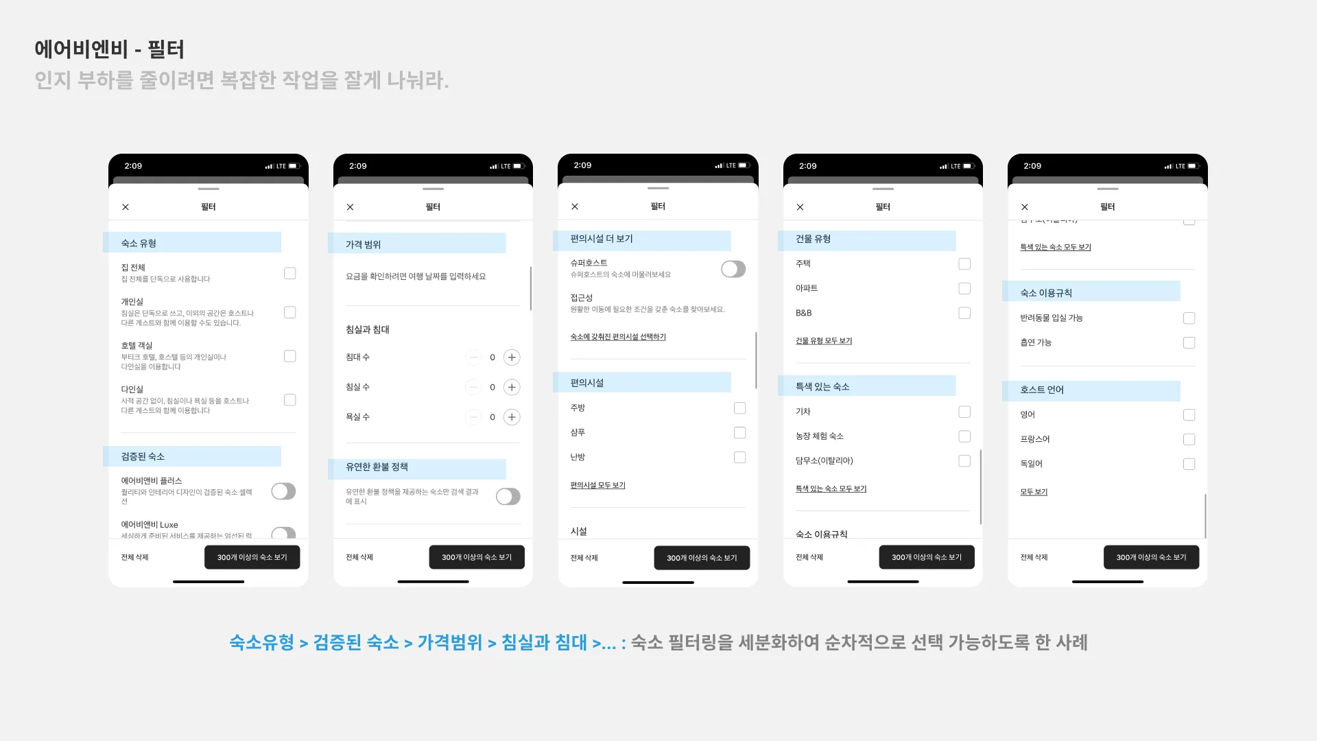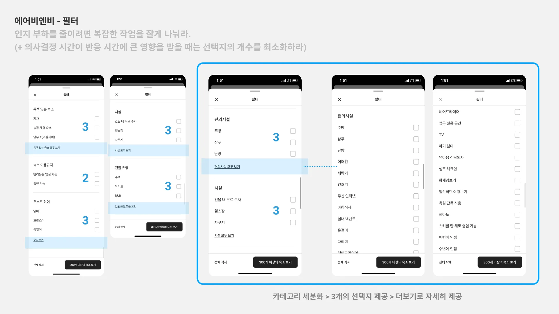 에어비엔비는 숙소 선택 전 까다로운? 필터를 가지고 있다. 하지만, 필터의 세분화와 순차적 선택을 유도하고 있어 사용자의 혼란을 줄여준다.