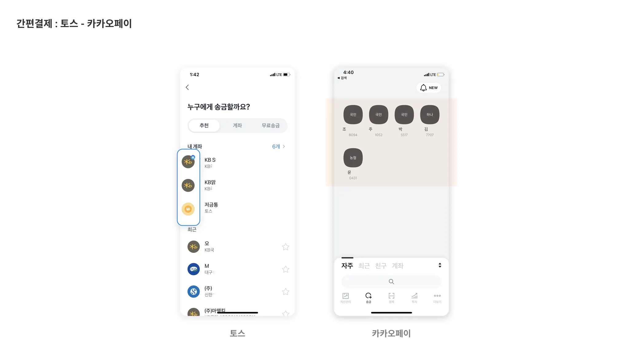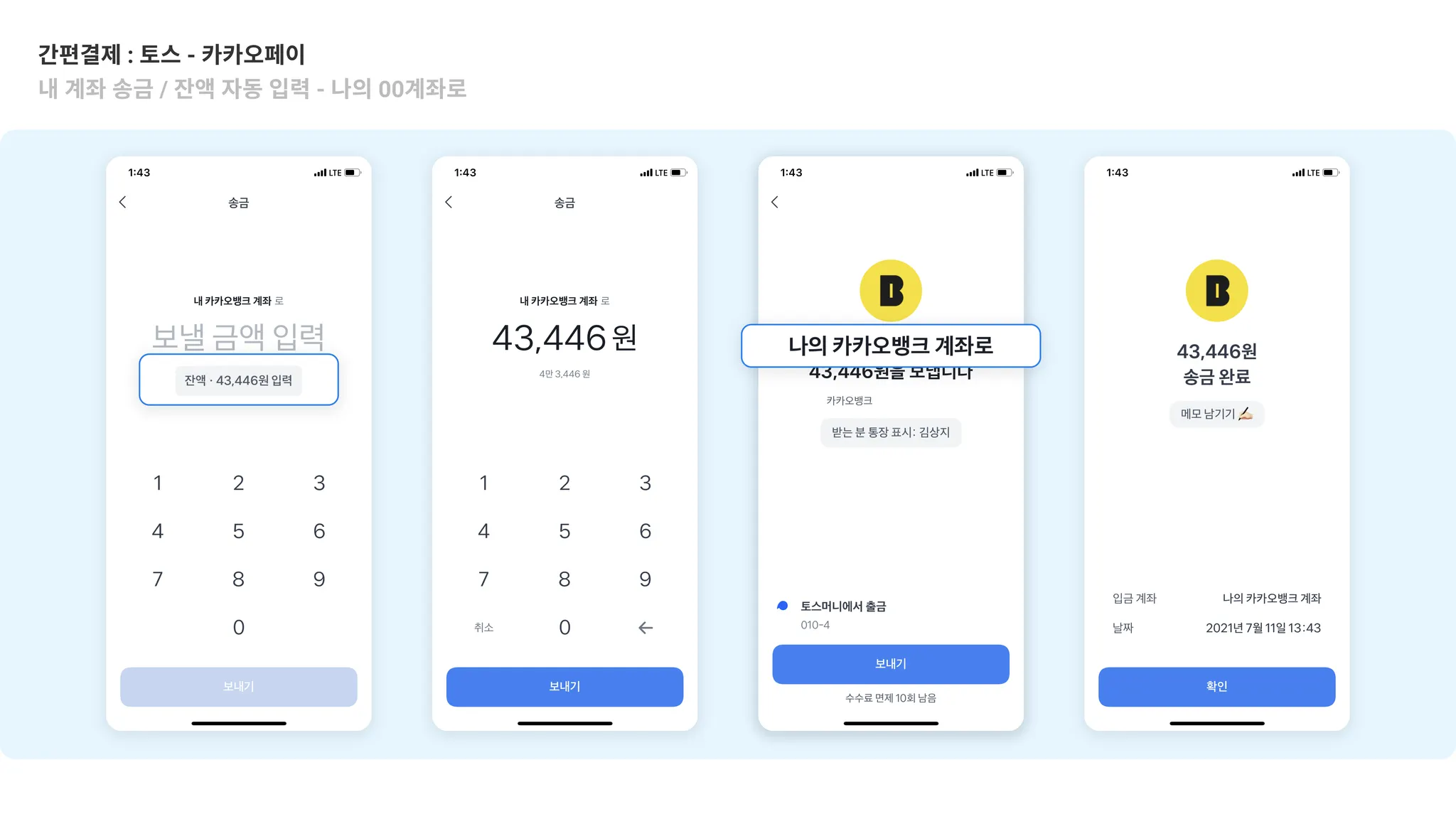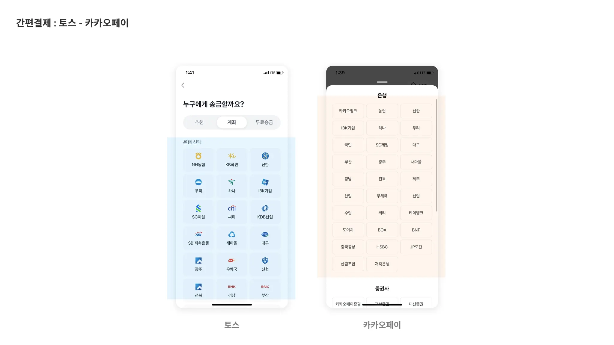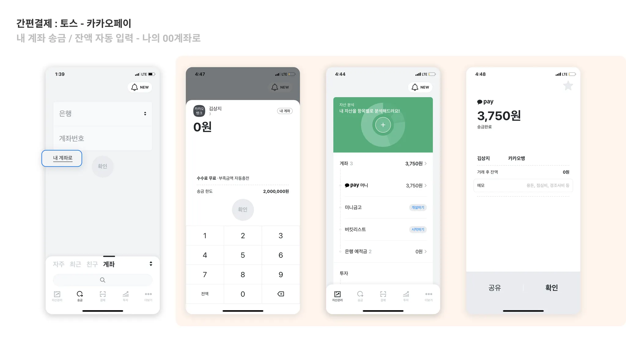 토스와 카카오페이는 간편 결제서비스로 기존 송금 서비스의 공인인증서와 로그인의 단계를 최소화한 사용성과 심미성을 고루 갖춘 서비스이다.