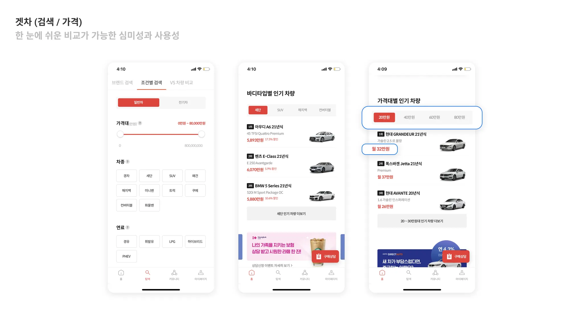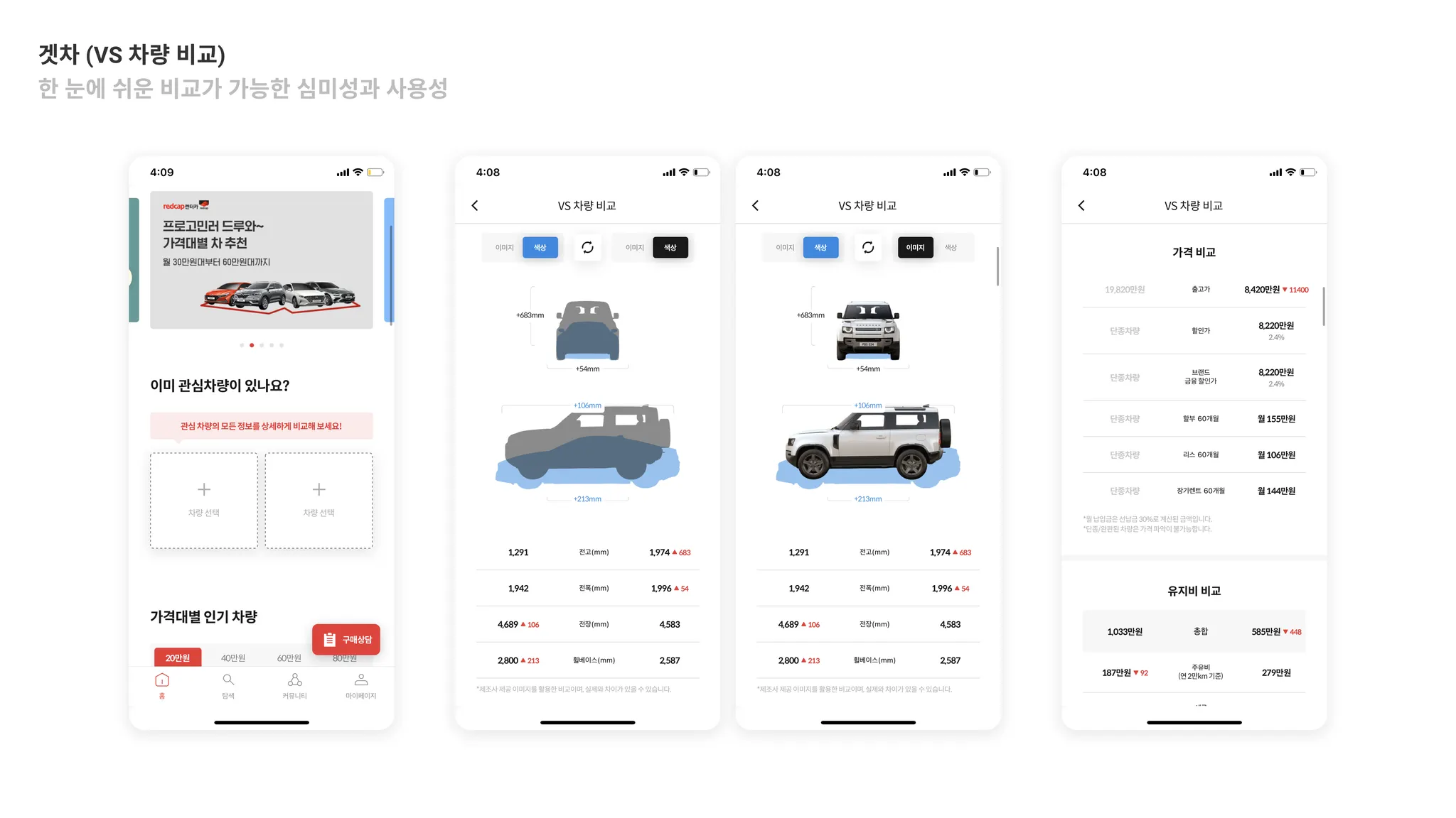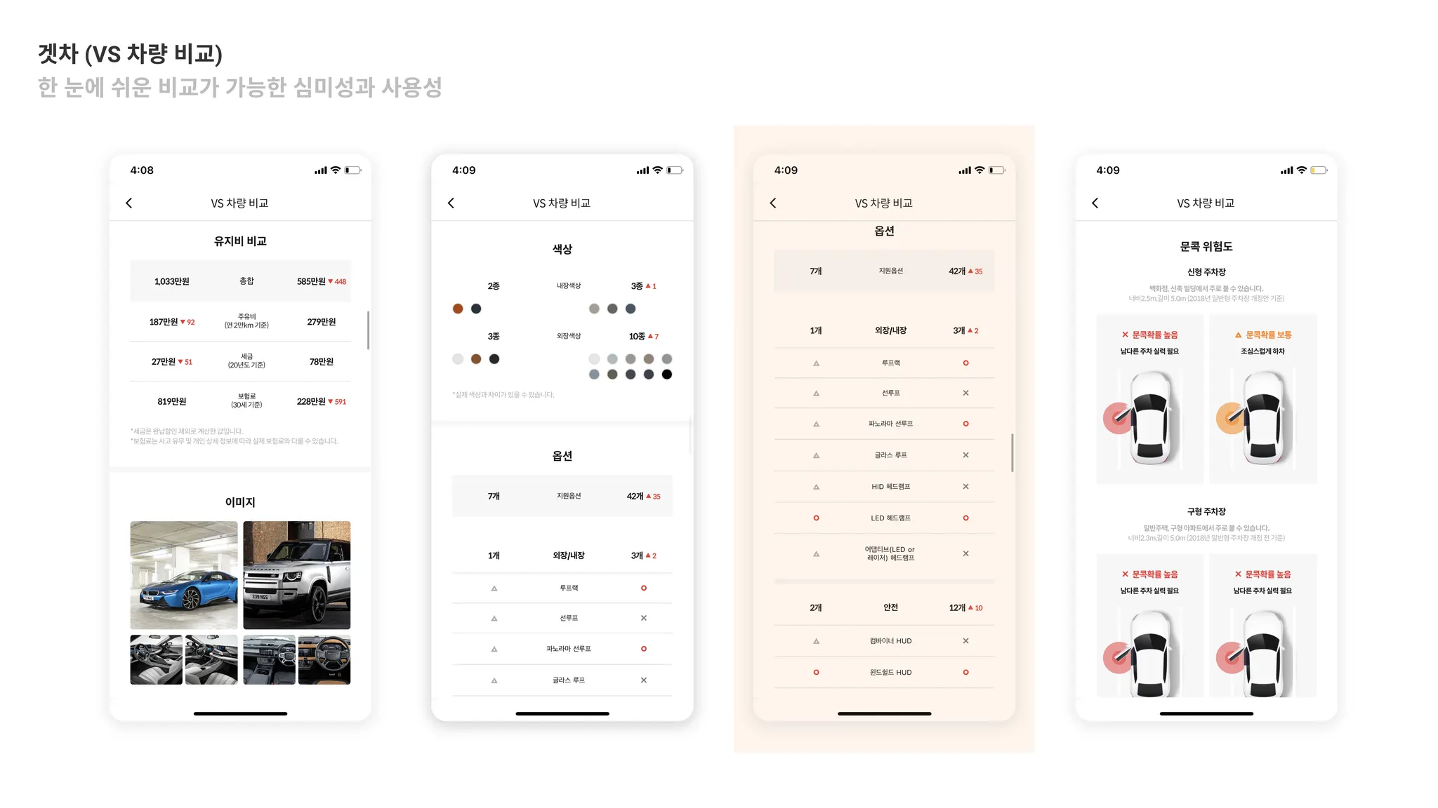 겟차의 VS 차량비교는 차량의 비용 / 크기 / 옵션 / 색상 / 이미지 / 문콕 등 차량의 쉽게 이해할 수 있다는 점에서 심미성과 사용성을 지닌 좋은 사례이다. 시각적으로 빠른 이해를 돕는 이미지-색상 필터가 가능하고, 표 사용 / 타이포의 색상 계층 구조 / 그래픽을 적극 활용하여 유저가 깊게 고민하지 않고 정보를 이해도록 돕고 있다.