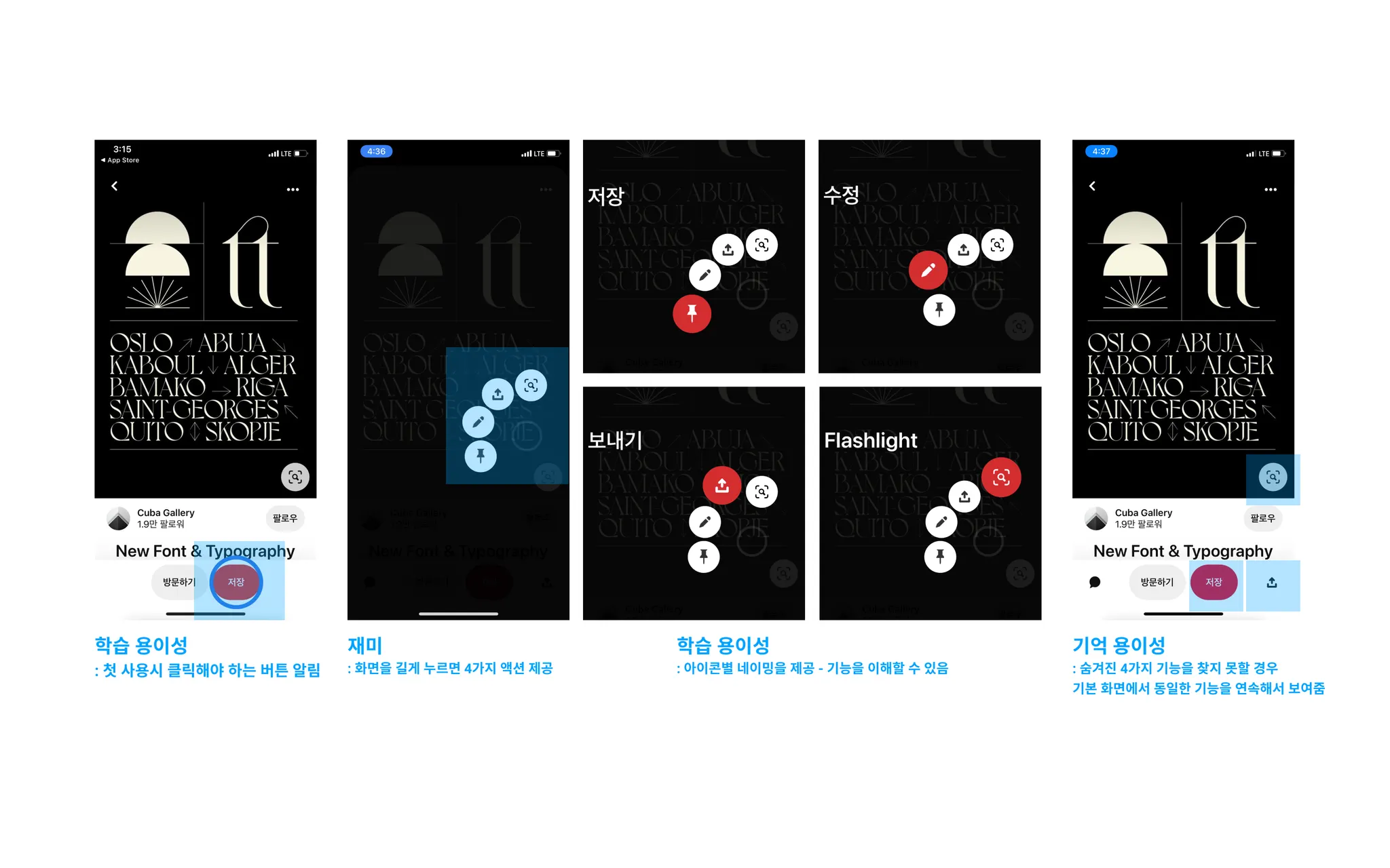 아이디어를 '핀'(저장)하는 기능을 제공하지만, 첫 유저에게 '저장'버튼을 해야 하는 것을 첫 사용시 파란 원형으로 알려주고 있다. 숨겨진 4가지 기능의 명칭을 명확히 설명해 주며 기억을 못할 경우를 대비하여 기본 화면에도 동일한 기능을 보여주고 있다.