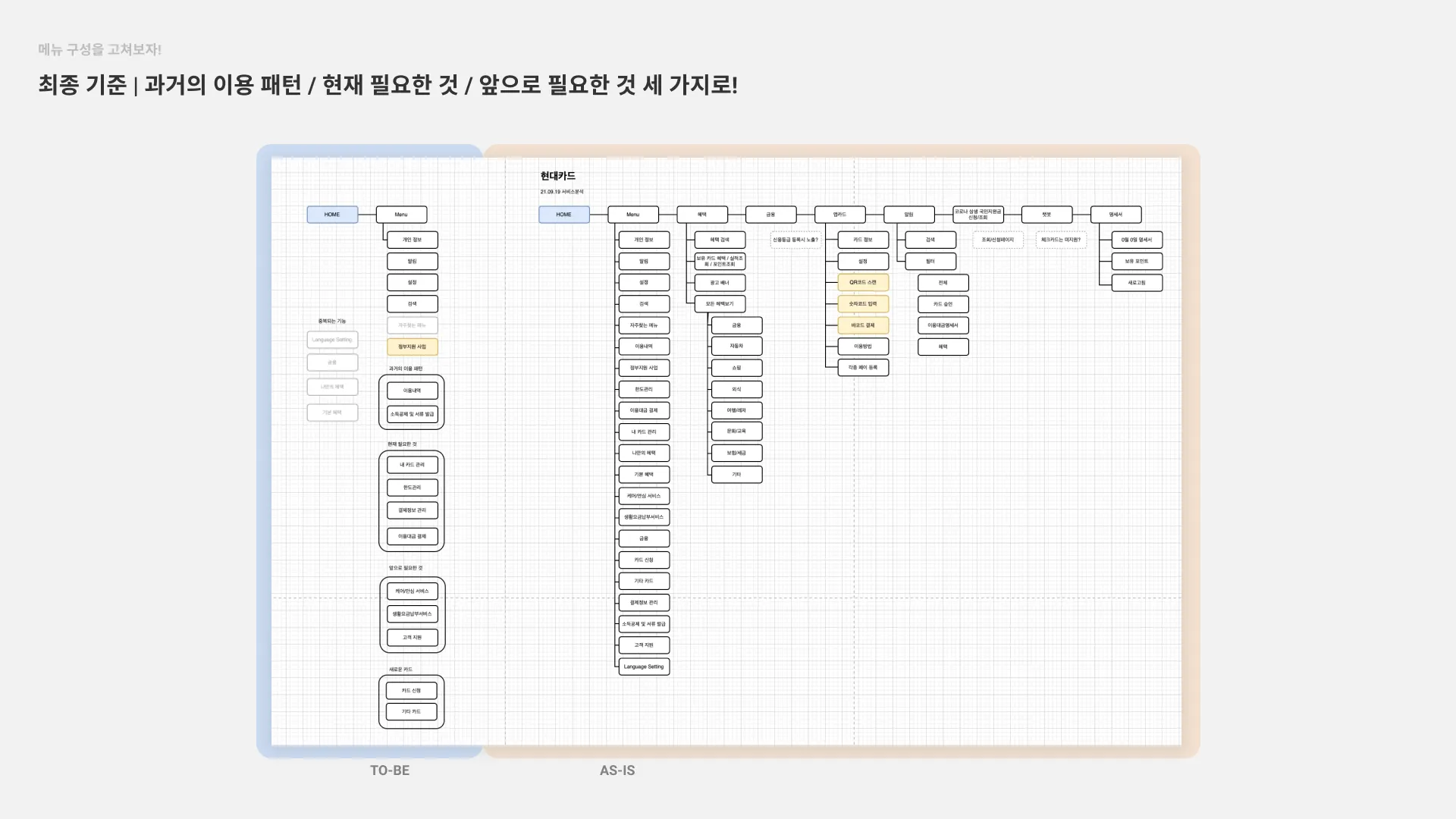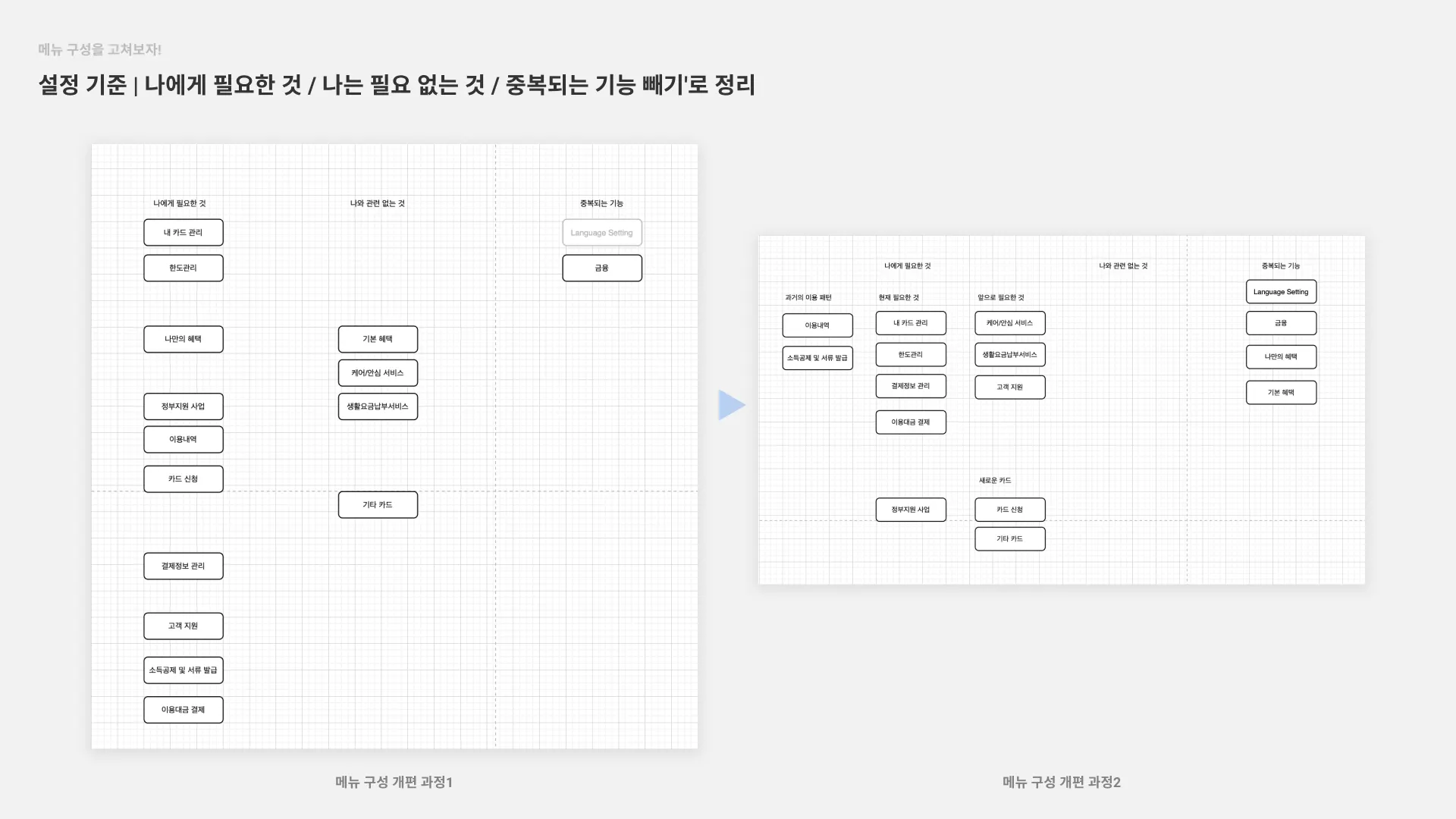 하지만 내가 정한 기준은 다양한 이해관계를 고려하지 못한 판단이었다. 필요에 대한 기준은 모두가 다르니까, 메뉴구성을 다시 정리했다. 기준은 과거의 이용 패턴 / 현재 필요한 것 / 앞으로 필요할 것 세가지로 나누니 메뉴가 정리되었다. 그리고 중복되는 기능은 과감하게 뺐다. 이유는 1) 금융/혜택은 홈에서 상단 메뉴로 보여주니까 빼야 할 이유가 분명했고, 2) 언어 설정도 보통 설정 안에 있다고 사용자는 경험으로 알고 있으니까 메뉴에 있을 이유가 없다.