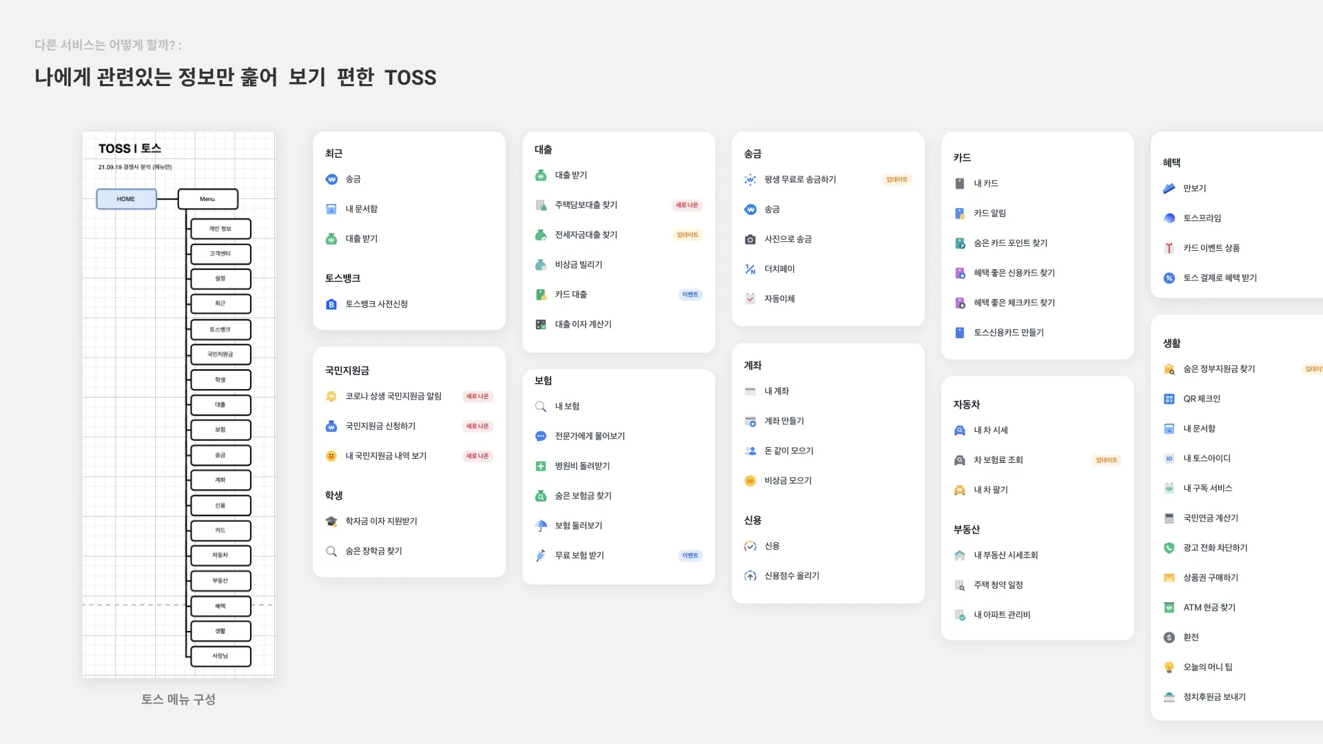 토스의 경우 많은 내용을 담고 있지만, 카테고리 이름에 따라 나와 관련없는 정보는 쓱-정보를 훑어 확인하기 수월했다. 그결과 상대적으로 복잡성을 덜느꼈던 것 같다.