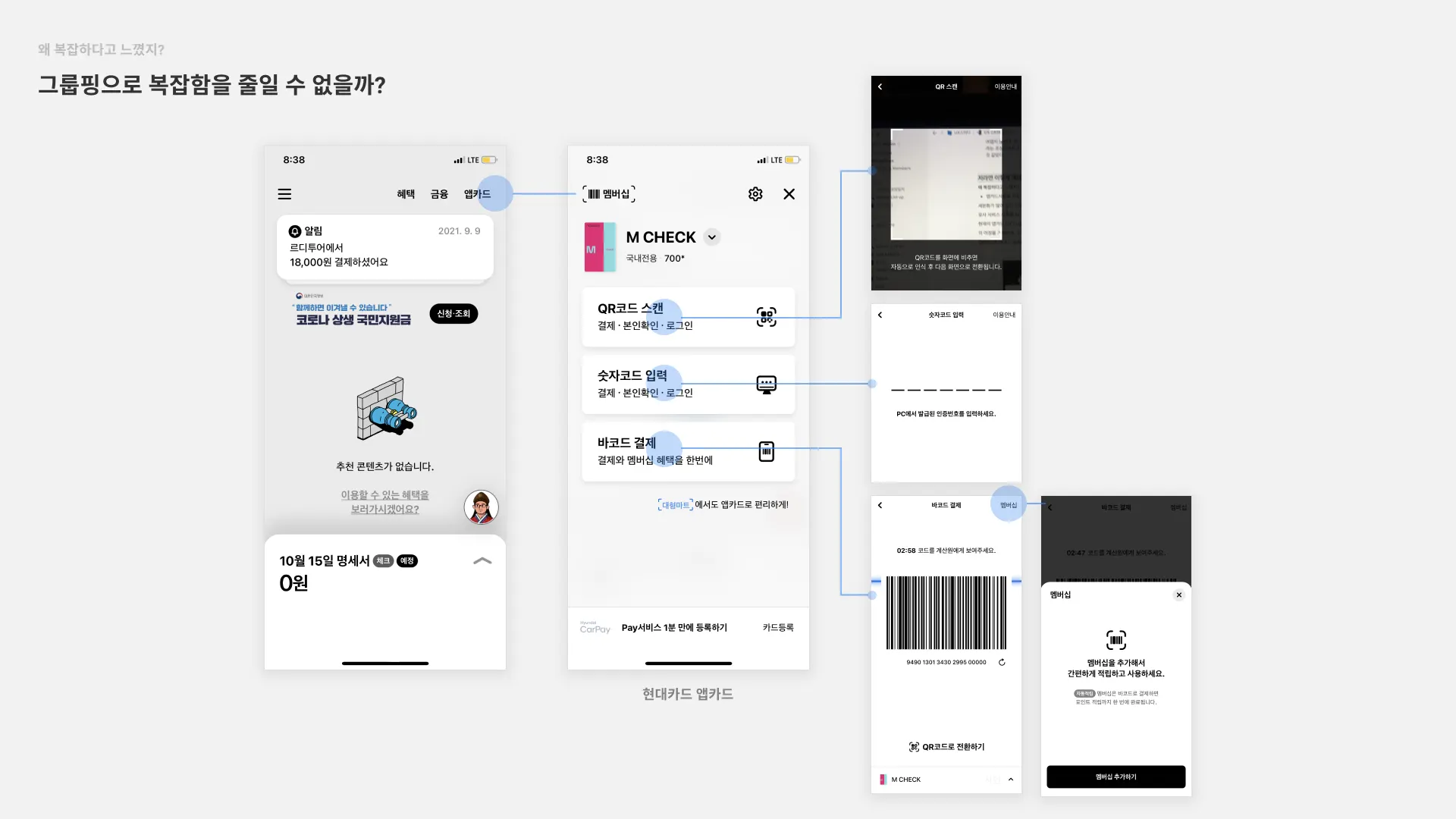 앱카드 서비스가 세분화되면서 오히려 서비스 진입 장벽이 높아진 것 같다. QR/바코드를 굳이 나눠야 할까?라는 궁금증이 들었고, 유사 서비스 사례를 찾아보니 한 컴포넌트 안에 두가지를 넣는 게 불가능한 것 같진 않다. 현재의 앱카드 UX FLOW는 앱카드 → QR코드 / 숫자코드 입력 / 바코드 결제 → 이용 의 여정을 거치는데, 숫자 코드를 사용하는 유저에게 QR 또는 바코드 사용을 독려할 수 있는 상황이라면, QR코드와 바코드 결제를 한 화면으로 구성해서 UX 과정을 한 단계 줄여주면 어떨까?