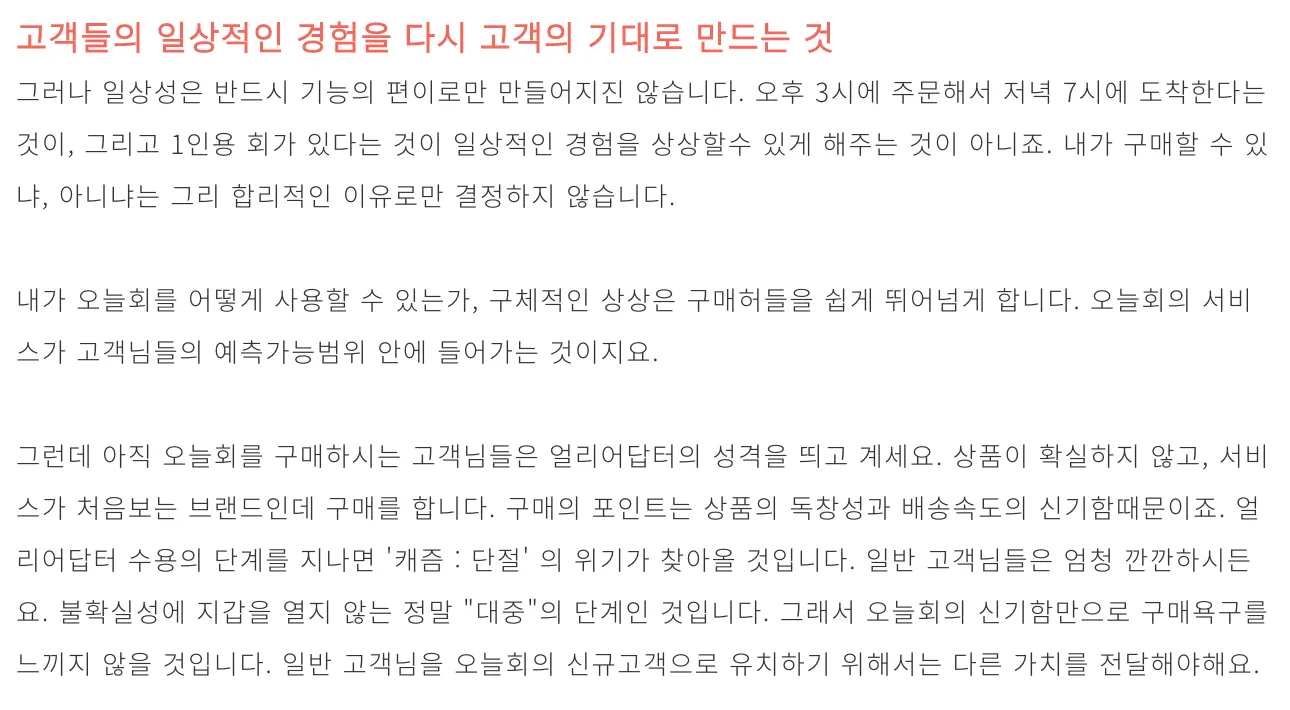 오늘회를 전체적으로 살펴보며 느낀 점은, 콘텐츠 없이도 사용자에게 상상/기대를 만드는 서비스 같다.