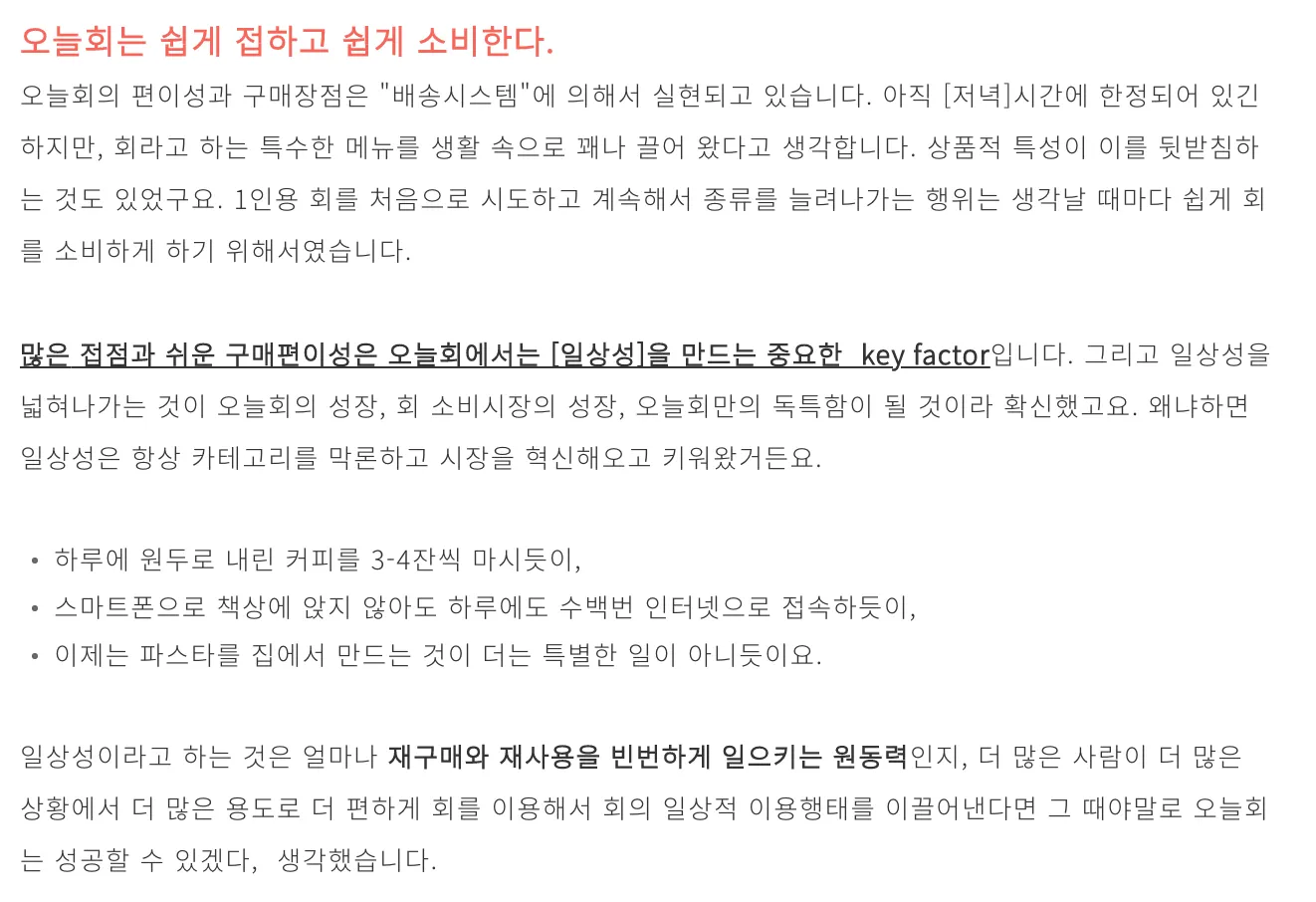 오늘회에 '선택넛지 | 악마는 디테일이다'가 곳곳에 보였다. '회'라는 특수한 제품을 다루기 위해, 사용자의 상황을 밀도있게 고민하여 만든 메뉴/기능/정보제공 등이 있었다. 어떻게 오늘회는 사용자의 행동을 유도하는지 살펴보았다.
