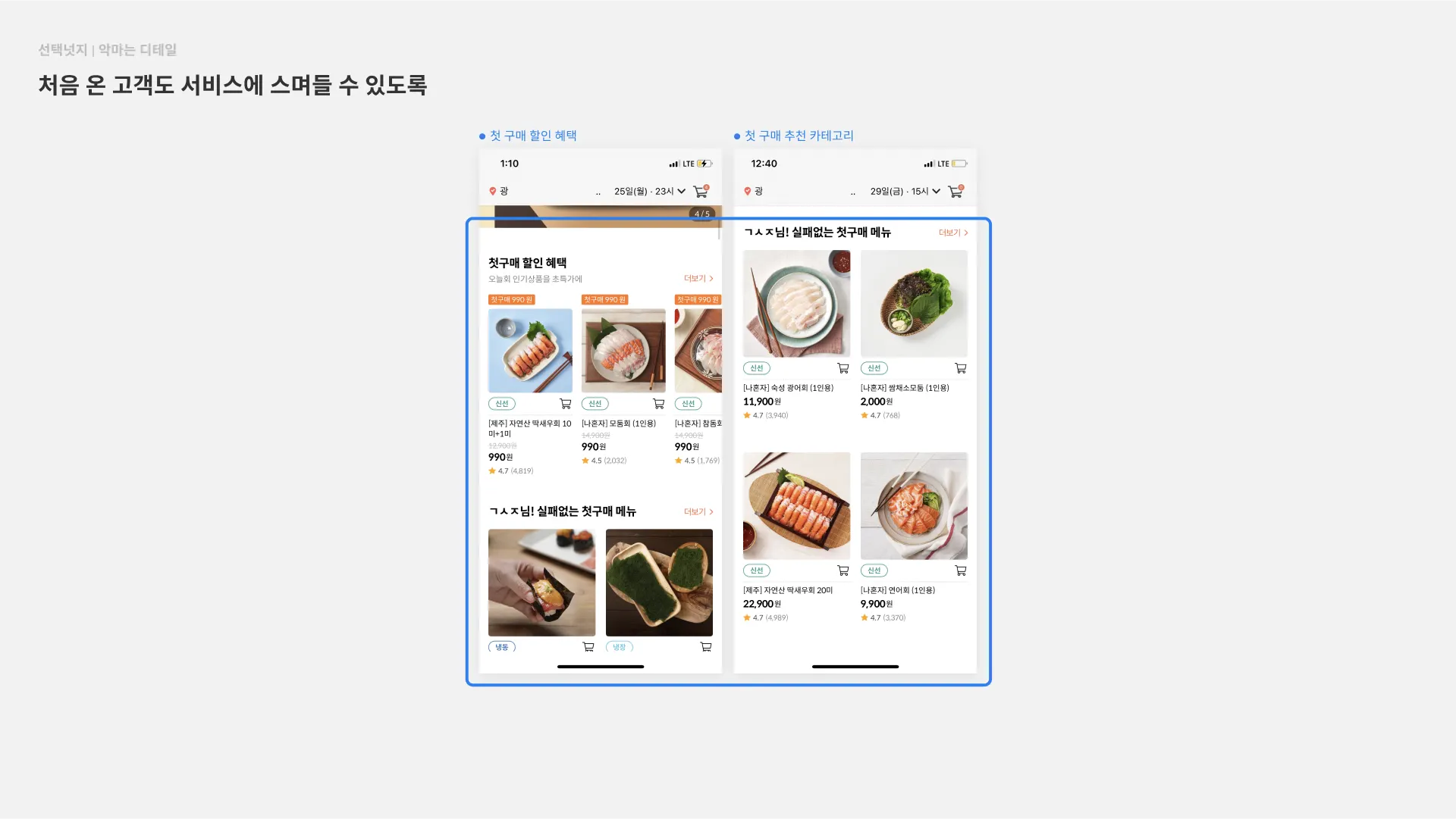 오늘회는 처음 온 고객이 서비스에 스며들 수 있도록 '990원 할인 혜택'과 첫 구매 메뉴 제안 등의 상품 리스트로 행동을 유도한다.