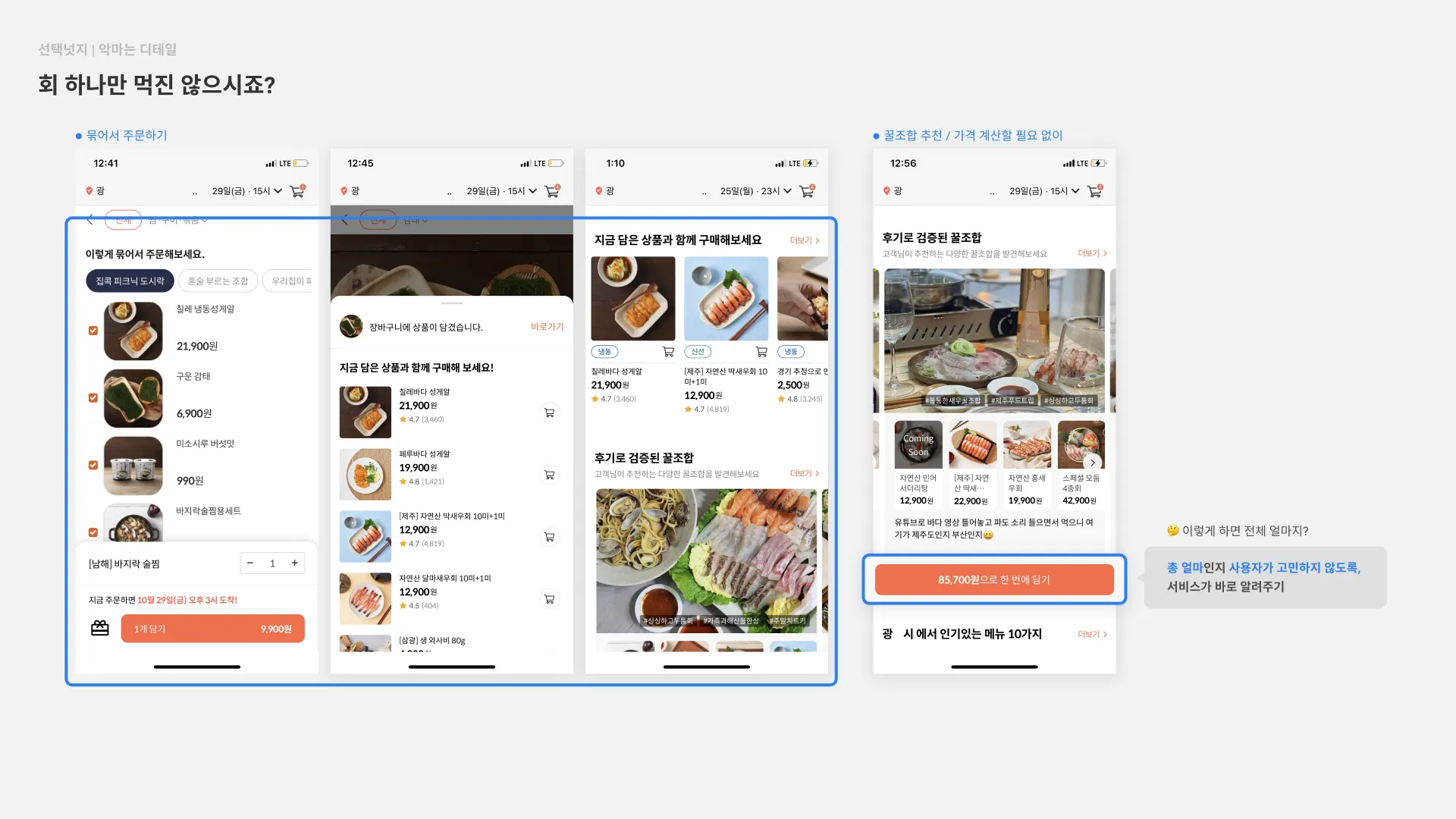 그래서 처음부터 묶음 상품 노출보다 개별 상품으로 저렴하게 접근하고 → 후에 보통 회를 곁들여 먹는 패턴에 맞게 조합 상품들을 보여주는 것 같다.